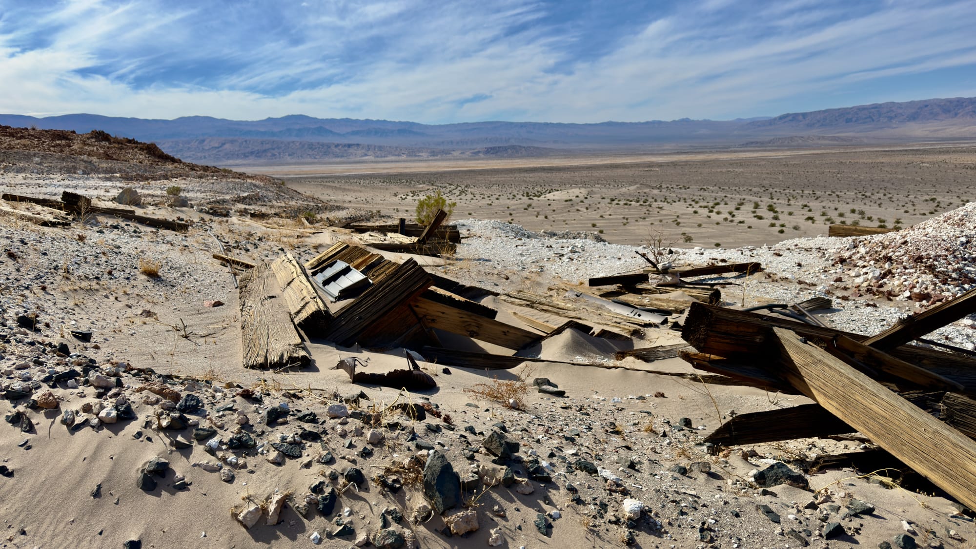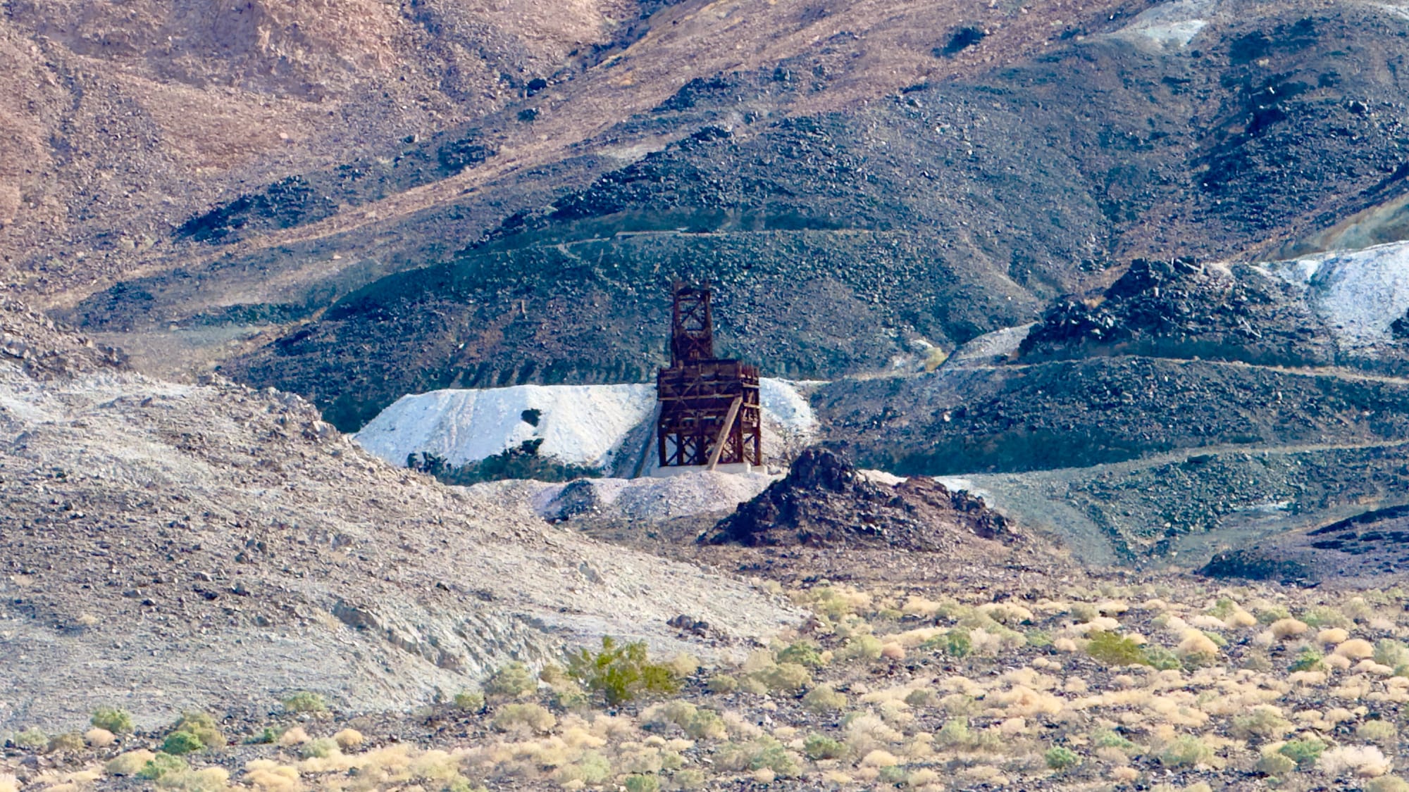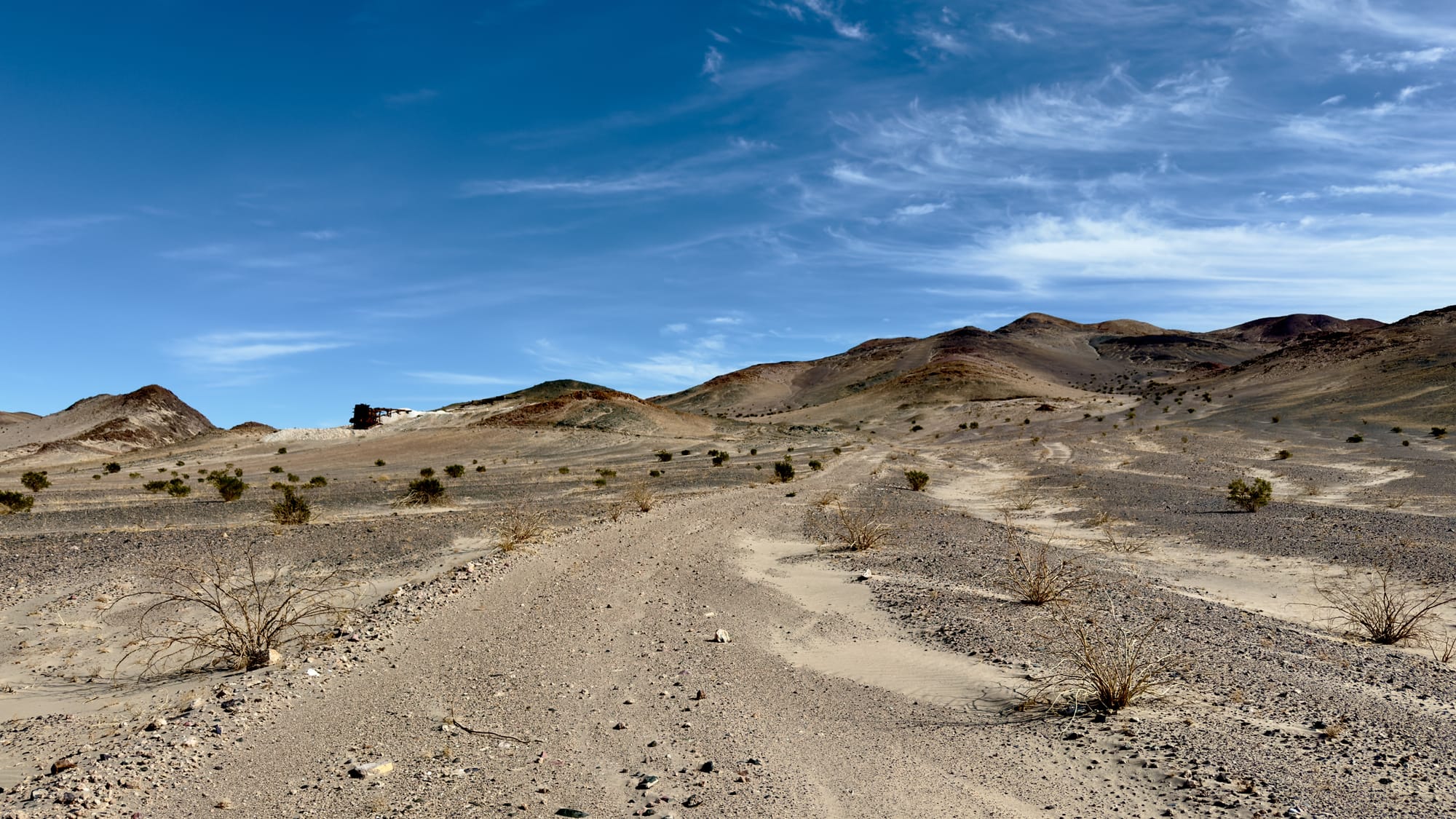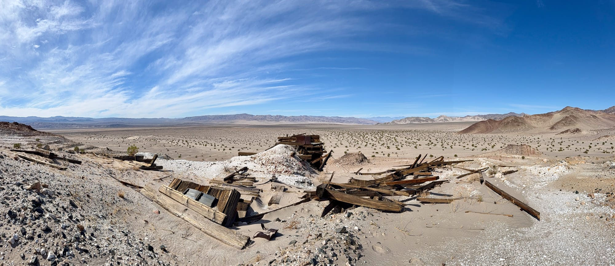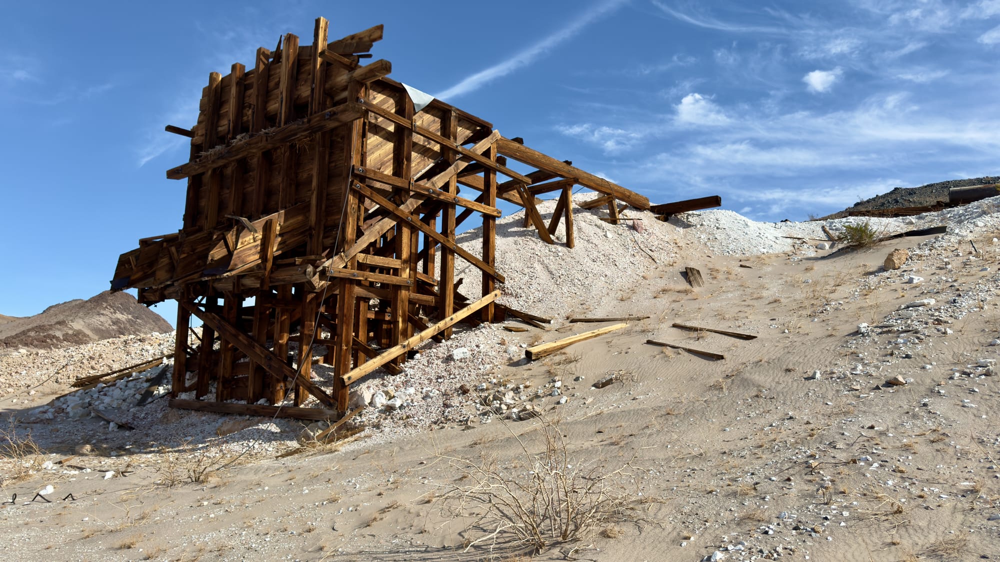 A little after BM165 which sits at the tip of a finger coming off the hills, you'll veer right up the western wash of Old Ibex Pass. The old ore bin of the Pongo Mine will come into view pretty fast. The Pongo Mine itself is nothing more than a collection of skeletal remains—wooden ore bins, a collapsed headframe, rusting machinery that once clawed talc from a single compartment incline shaft that is now sanded in (and has coyote tracks down it). This was Ernest Huhn’s dream in the 1930s before it fell to the Southern California Minerals Company and then, inevitably, silence. 12,500 tons of talc later, they packed up and left in 1955, leaving behind their junkyard for the desert to reclaim. Interestingly, these claims, along with several others in the Ibex Hills, were owned by Pfizer Inc. until finally being acquired into DVNP.