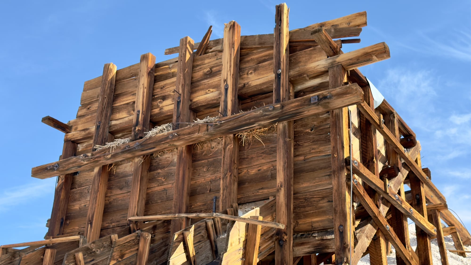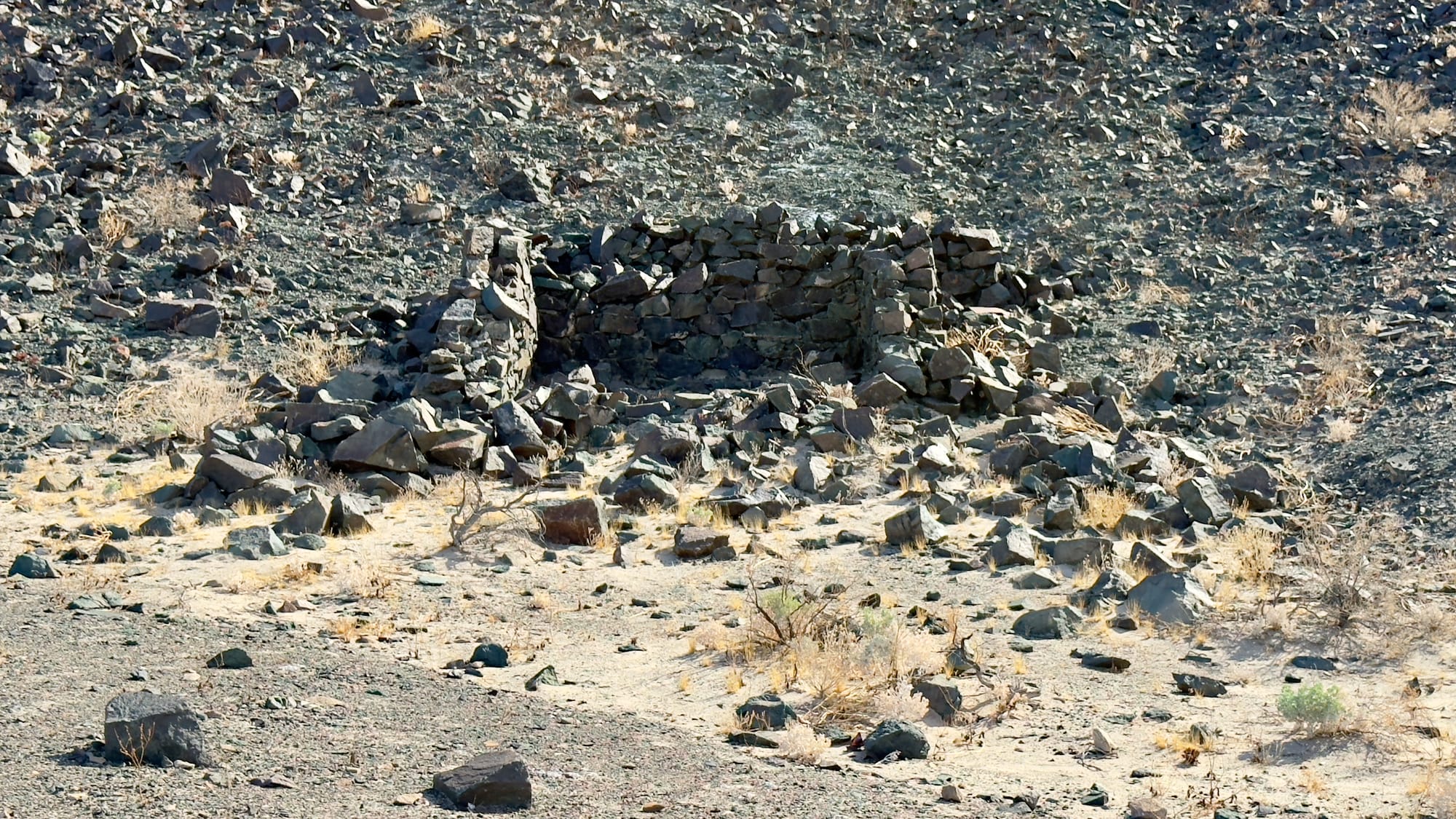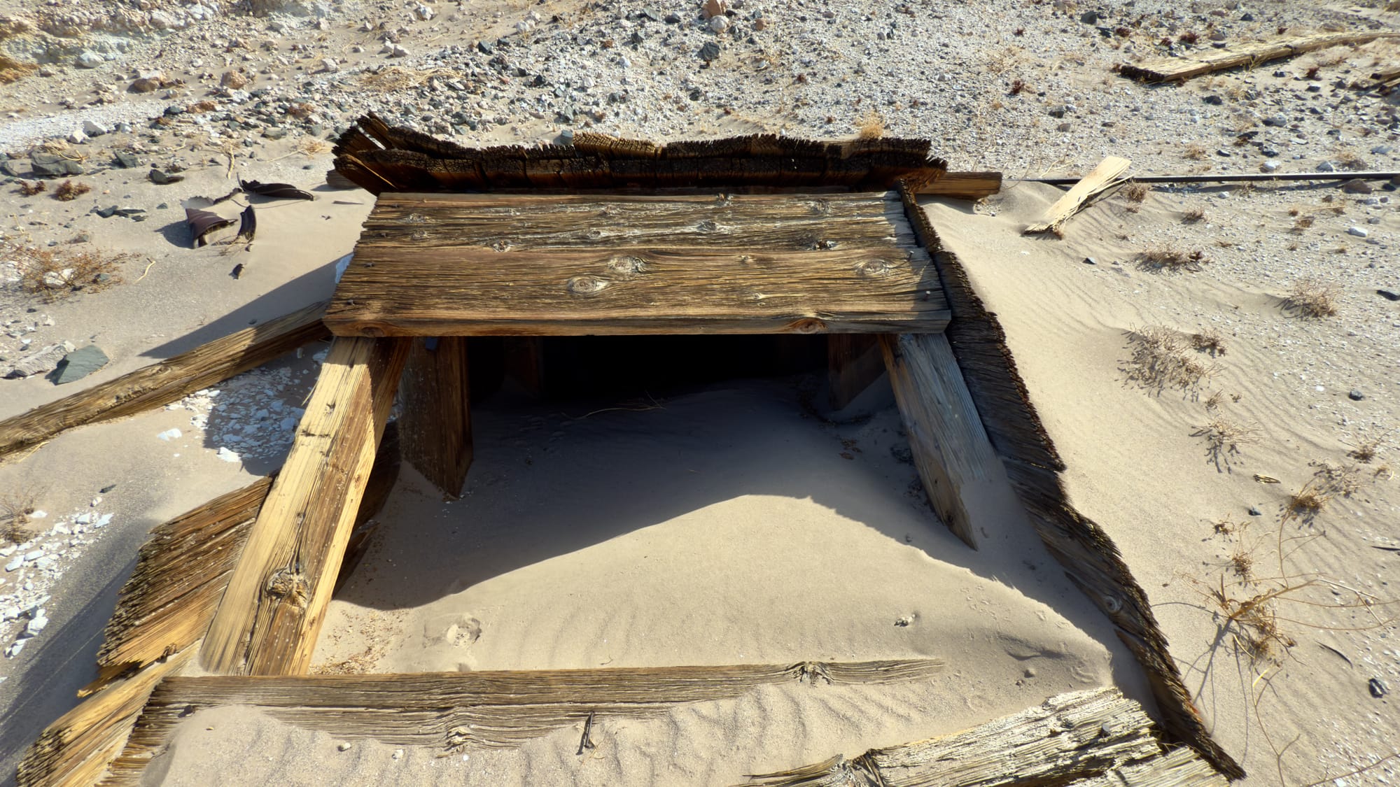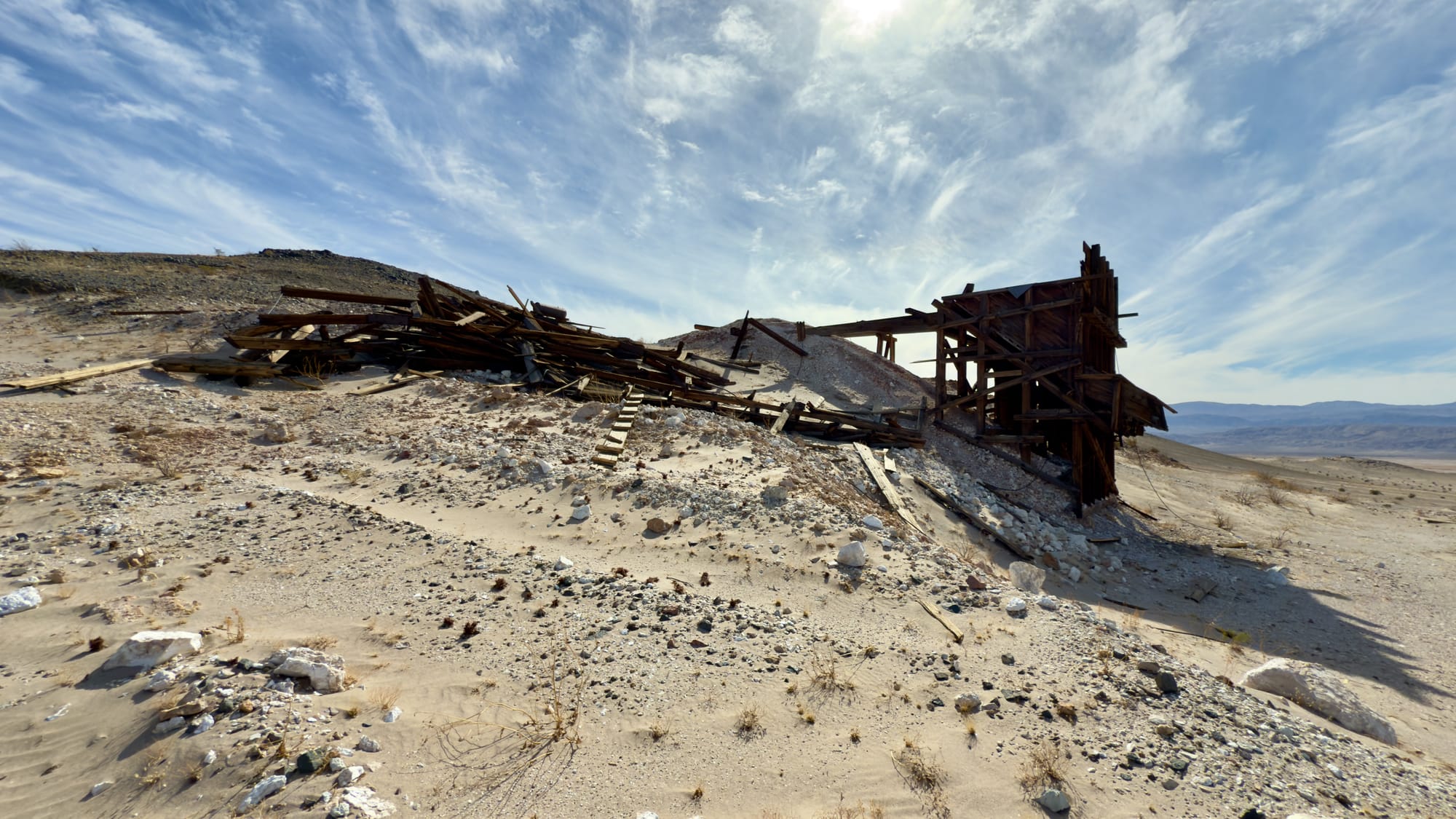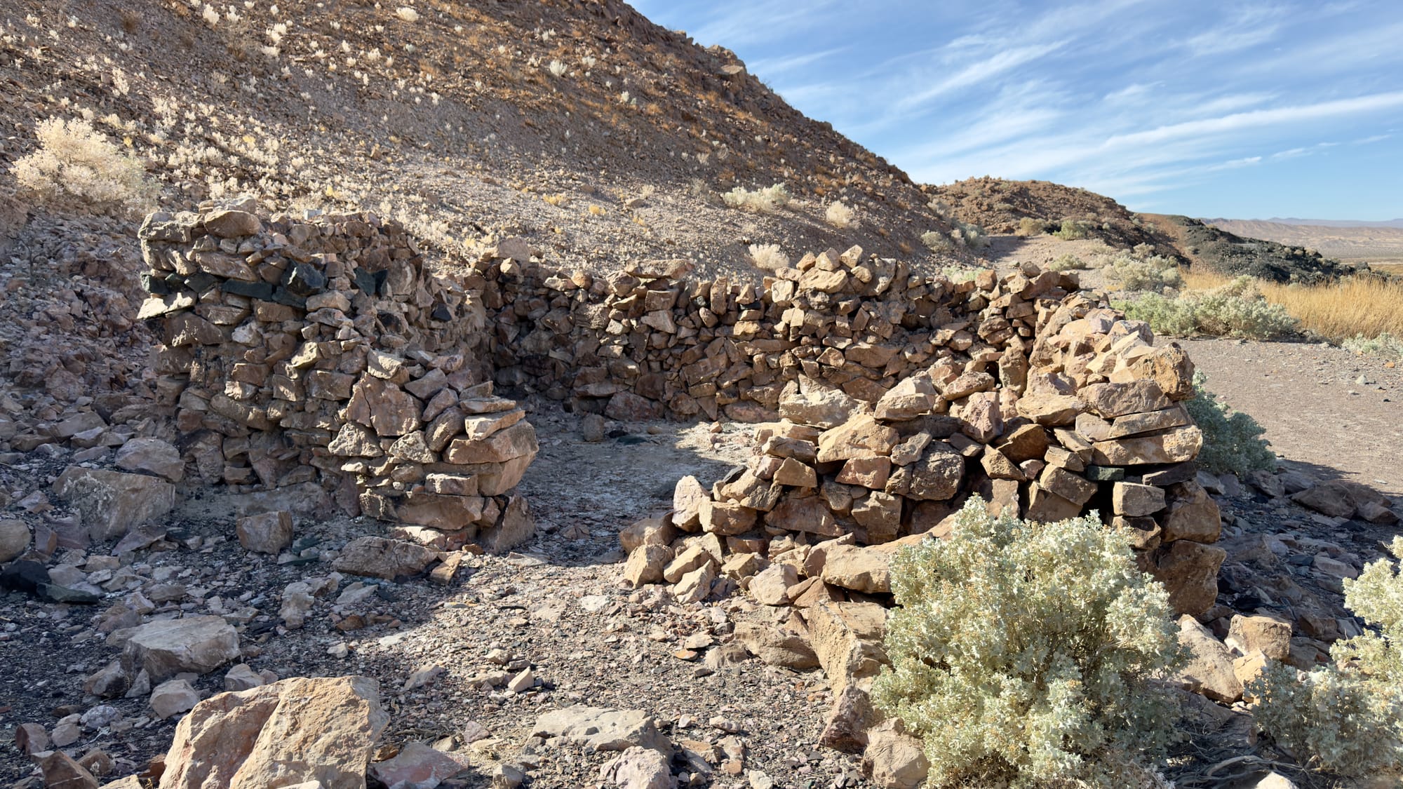 A little after BM165 which sits at the tip of a finger coming off the hills, you'll veer right up the western wash of Old Ibex Pass. The old ore bin of the Pongo Mine will come into view pretty fast. The Pongo Mine itself is nothing more than a collection of skeletal remains—wooden ore bins, a collapsed headframe, rusting machinery that once clawed talc from a single compartment incline shaft that is now sanded in (and has coyote tracks down it). This was Ernest Huhn’s dream in the 1930s before it fell to the Southern California Minerals Company and then, inevitably, silence. 12,500 tons of talc later, they packed up and left in 1955, leaving behind their junkyard for the desert to reclaim. Interestingly, these claims, along with several others in the Ibex Hills, were owned by Pfizer Inc. until finally being acquired into DVNP.