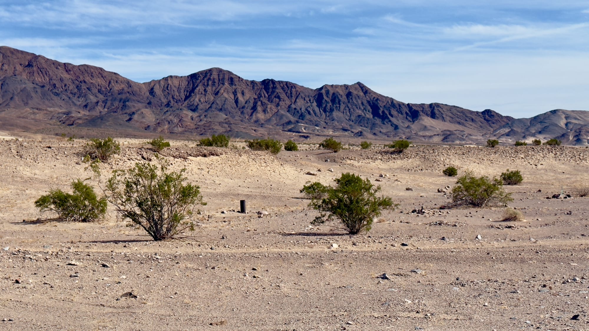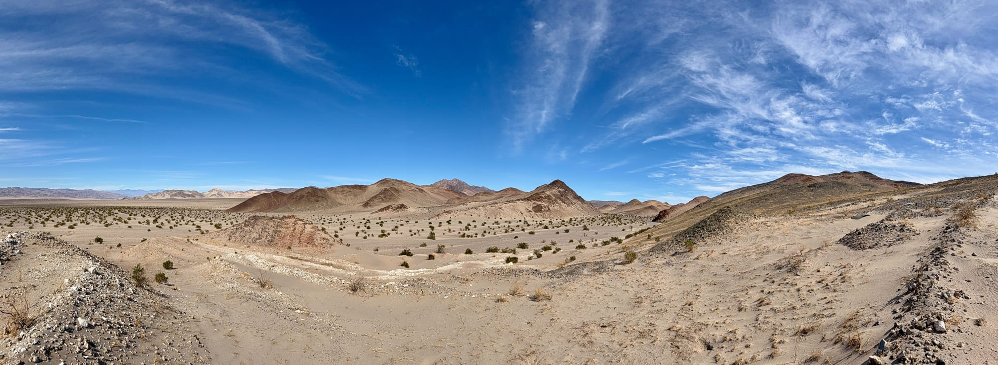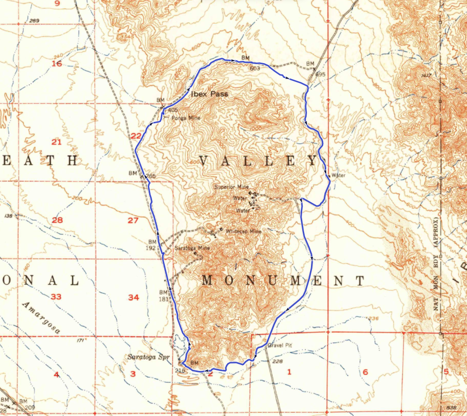We're now descending down from the pass, following the original road down a deep wash until it eventually joins with the modern Ibex Valley Road near the abandoned well (labeled Water on the old topo). Today this well is just a sand filled steel casing poking out of the ground. Now just follow the modern road south then southwest, headed back toward Saratoga Spring, winding through forgotten claims and rust-streaked geology. You'll likely encounter a confused backcountry tourist or two along this section. To your east are the amazing Ibex Dunes and behind them the Saddle Peak Hills (both great trips for another day).