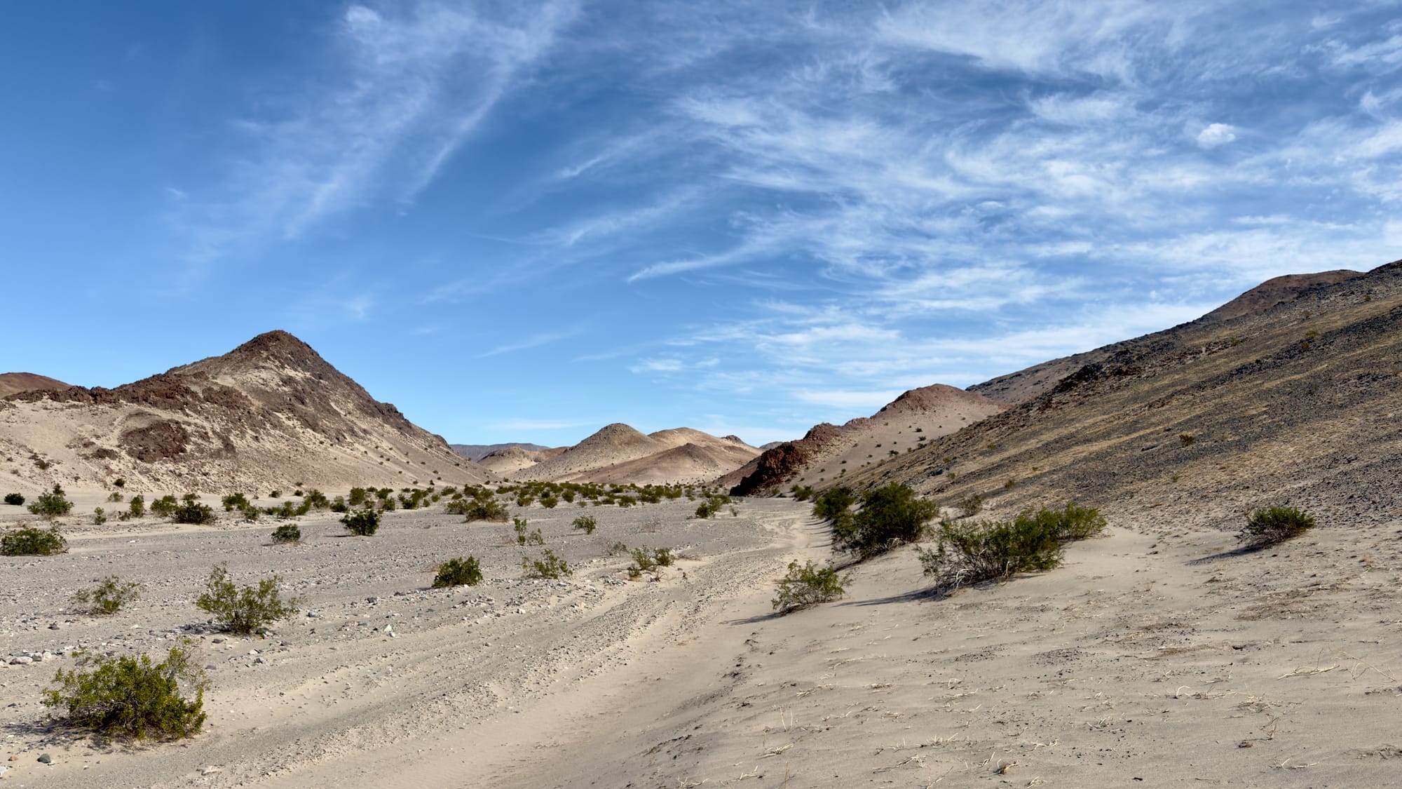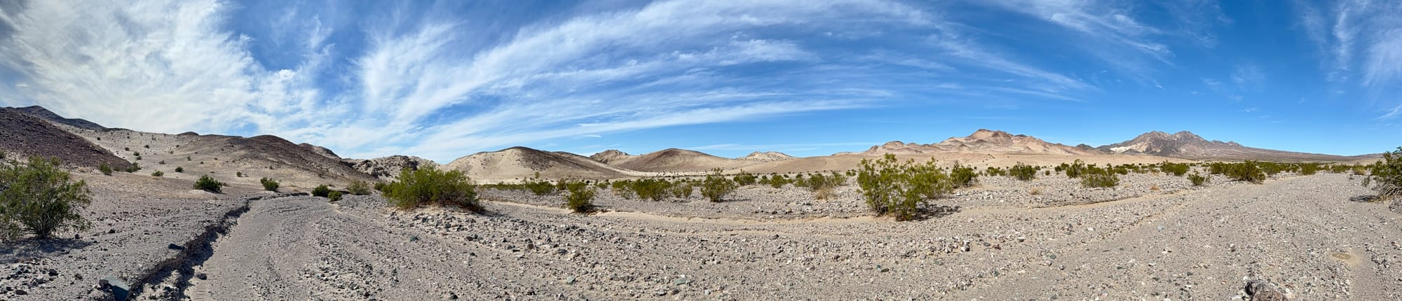 Old Ibex Pass isn't actually the divide pass and you'll continue climbing to the northeast for some time. The goal for this loop is to hug Ibex Hills, keeping them off to the right, without too much up and down. Eventually, this will result in a southeastward turn and passed the point labeled BM603 you may or may not find an old southeast leg of the road wye to follow. If you stay directly in the wash here, you'll add a little distance while hugging the other leg of the wye. In both case, you'll eventually hit a south flowing wash, drop in here and head south in the deep wash. The current Ibex Valley Road is actually a bit further east but on this hike we're following the historical one.