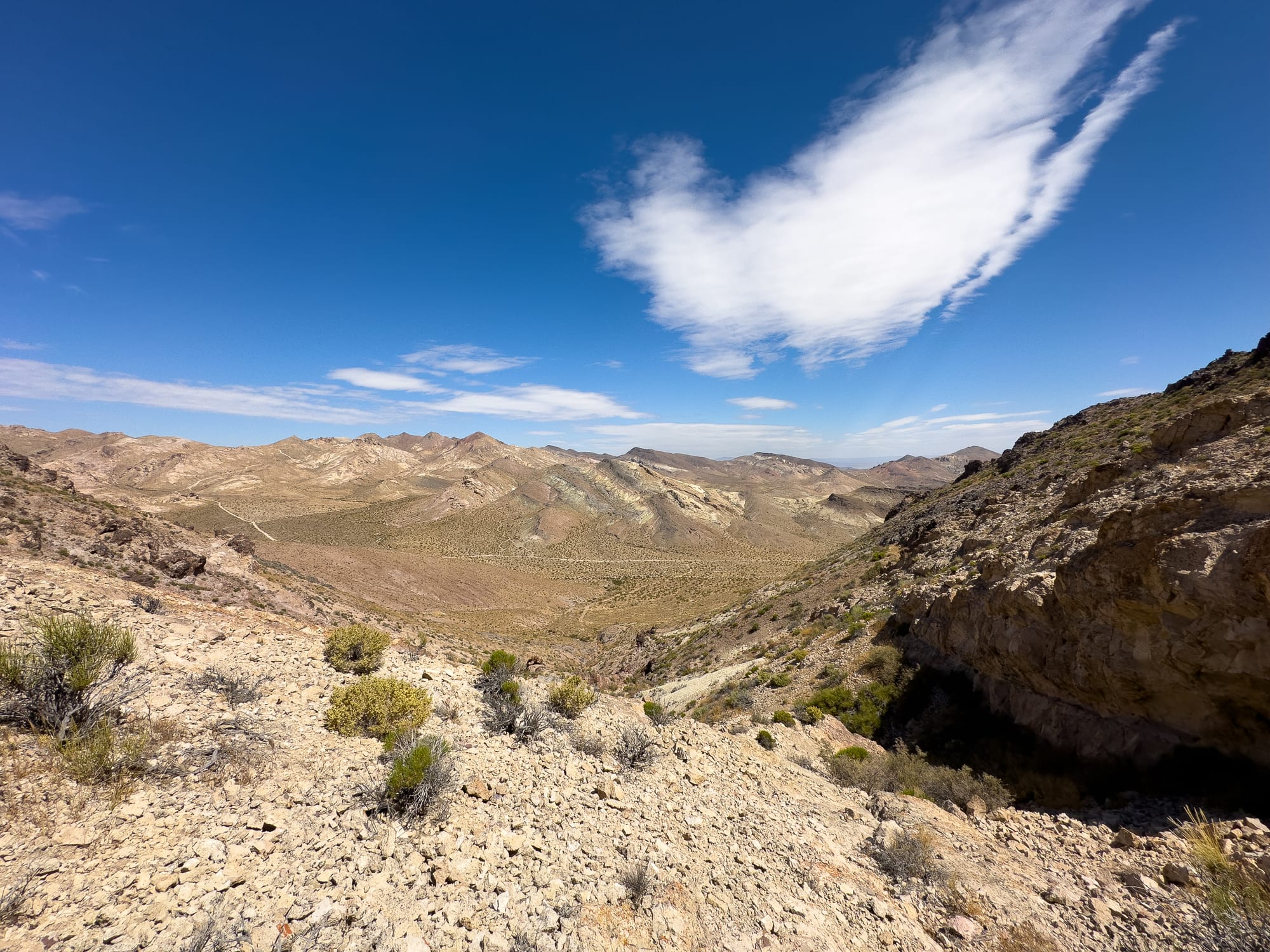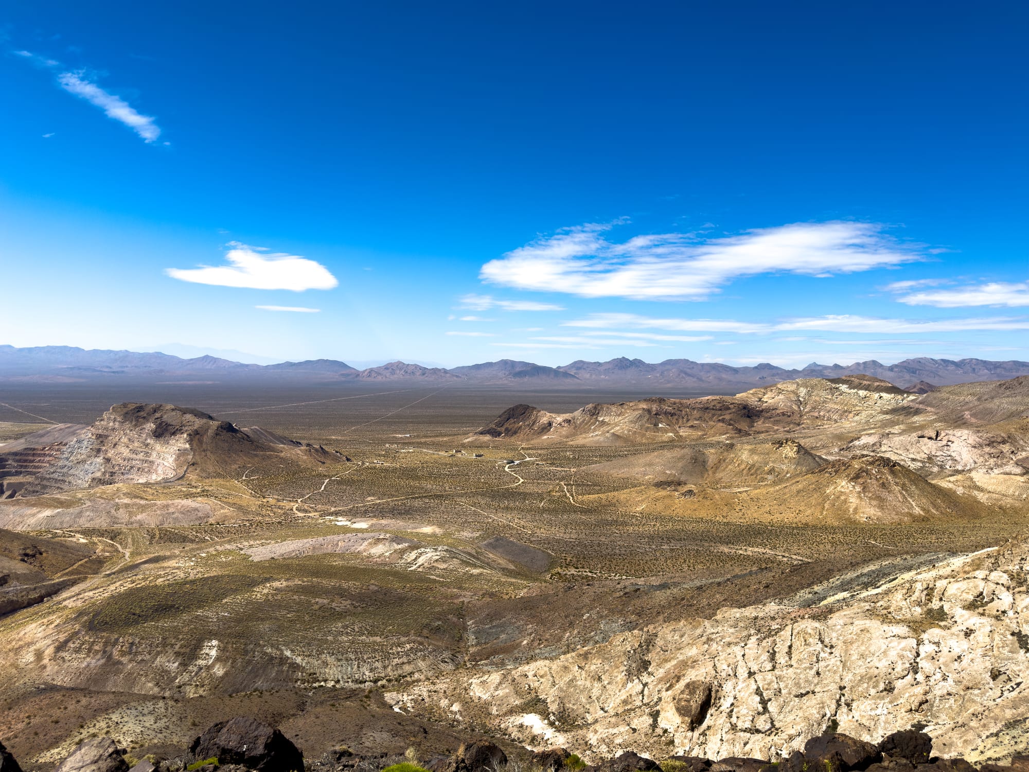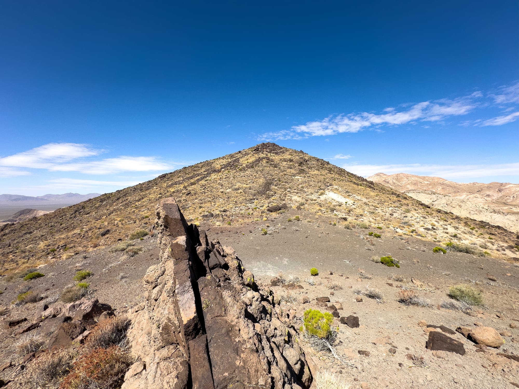 On this hike, we hit Black Peak and Rainbow Mountain which overlook the ghost town of Rhyolite, Nevada. Rhyolite, located near the eastern edge of Death Valley, emerged as one of Nevada's most famous ghost towns during the early 20th century. Founded in 1904, Rhyolite quickly grew during the gold rush, spurred by the discovery of rich ore in the surrounding Bullfrog Hills. Climbing Black Peak and Rainbow Mountain offers expansive views of the two large open pits of the Montgomery-Shoshone Mine and the Bullfrog Mine on Ladd Mountain.