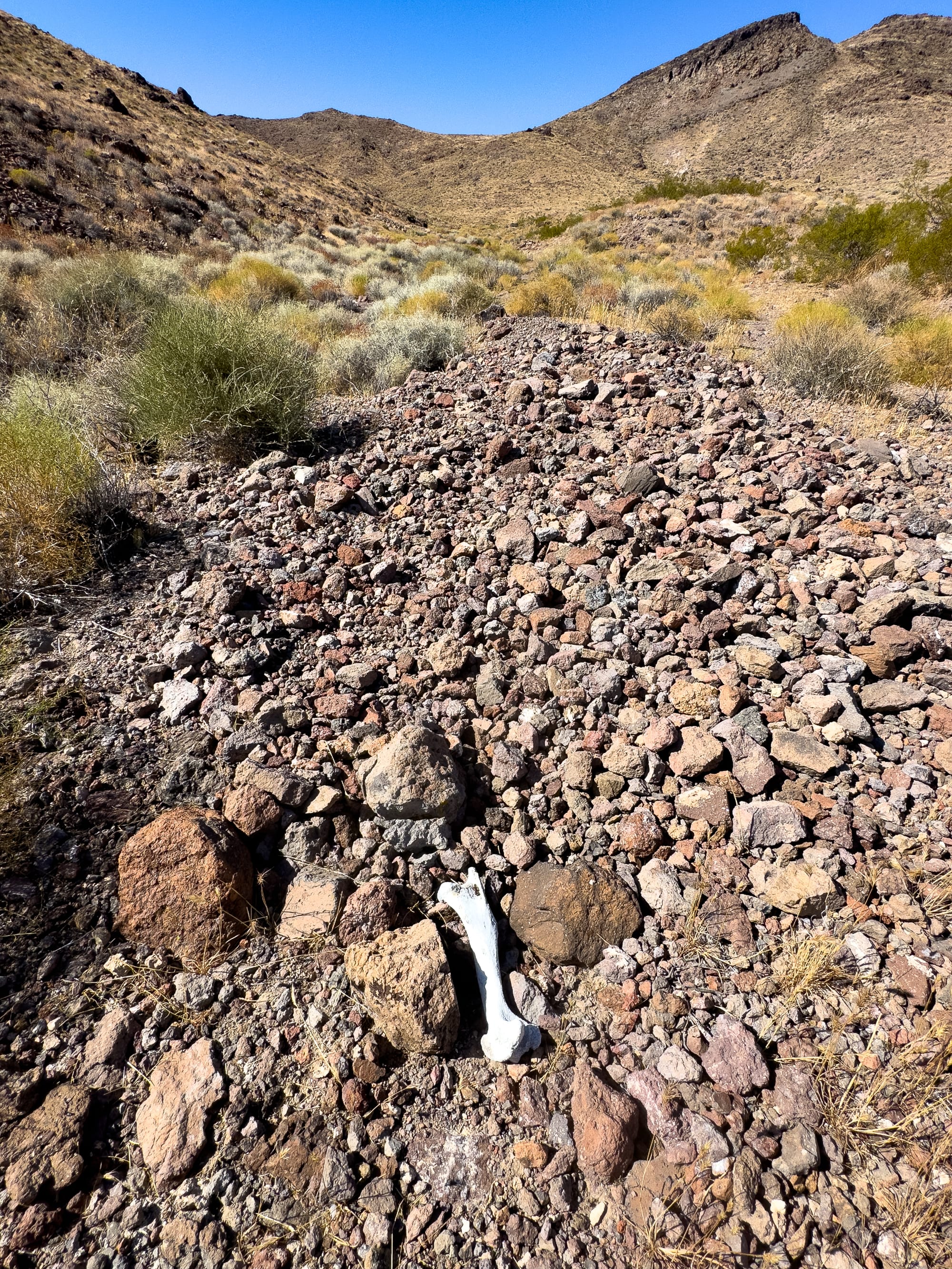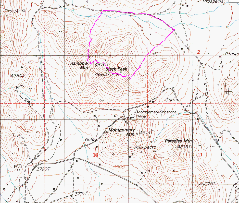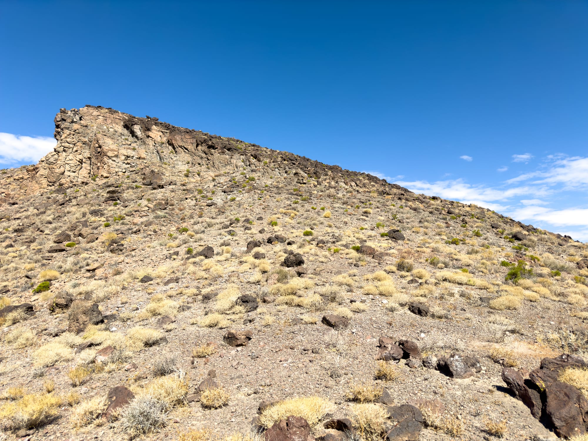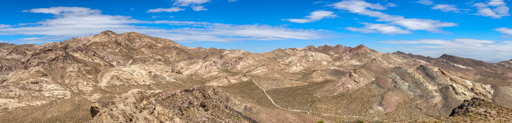 On this hike, we hit Black Peak and Rainbow Mountain which overlook the ghost town of Rhyolite, Nevada. Rhyolite, located near the eastern edge of Death Valley, emerged as one of Nevada's most famous ghost towns during the early 20th century. Founded in 1904, Rhyolite quickly grew during the gold rush, spurred by the discovery of rich ore in the surrounding Bullfrog Hills. Climbing Black Peak and Rainbow Mountain offers expansive views of the two large open pits of the Montgomery-Shoshone Mine and the Bullfrog Mine on Ladd Mountain.