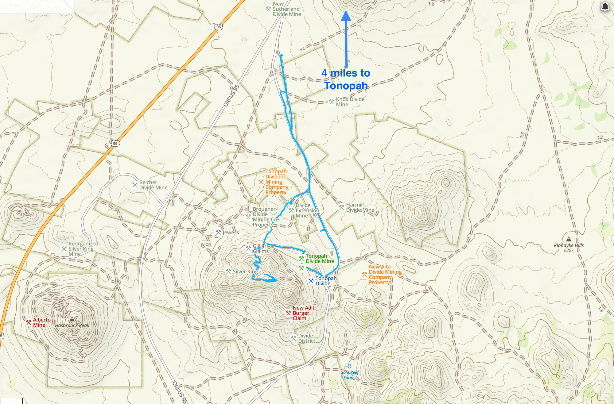 The Divide district, originally known as Gold Mountain, is situated about 5 miles south of Tonopah in the Klondyke Hills. Renamed Divide after new discoveries in 1917, it is centered on the divide along the Tonopah-Goldfield road, west of Gold Mountain (6,647'). Nearby, the Gold Reef district lies on the southeast flank of Gold Mountain, and both are now part of the current Divide district. Historical references such as The Nevada Miner (1902) also mention a Dutch Mountain district about 6 miles south of Tonopah, likely encompassing this area.