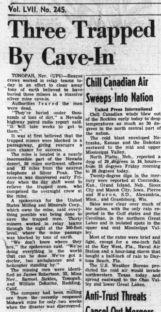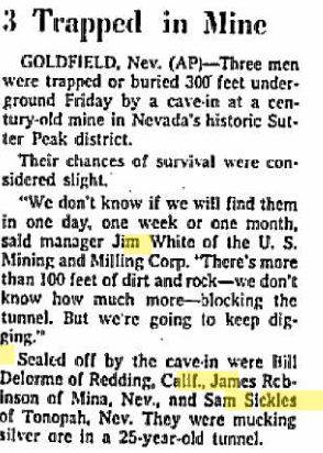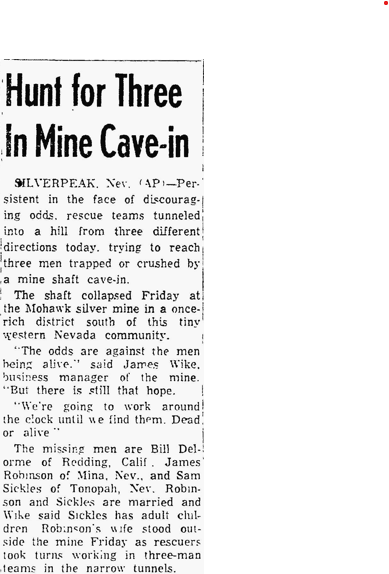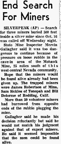 In 1959, operations at Mohawk were resumed under U.S. Mining & Milling Co., but a disaster struck that would become a defining moment in the mine’s history. On October 16, 1959, a massive cave-in occurred in the Hines 202 stope (named after E. R. Hines, one of the principals) at the 300 level of the mine where three miners, on the overnight shift, were removing equipment from the condemned stope. Hundreds of tons of rock collapsed without warning, trapping the three miners. Despite immediate and heroic rescue attempts – specialists and equipment were brought from across the country – the three men could not be reached. After eleven days of continuous but fruitless digging, the Nevada State Mining Inspector, Mervin Gallagher, called off the rescue on October 27 and ordered the mine sealed for safety. Tragically, the Mohawk Mine became the final resting place of the three miners: William "Bill" Delorme, James “Jimmy” Roberson, and Samuel "Sam" Sickles. Contemporary newspapers provided detailed coverage of the accident and the coroner’s inquest (see Tonopah Times-Bonanza, Nov. 6, 1959). The investigation revealed that an extensive open stope had been mined out, reportedly up to 80 feet in height, and its unsupported span likely contributed to the catastrophic rockfall. The incident underscored the dangers of aggressive underground mining in the fractured, brecciated rhyolite host rock.