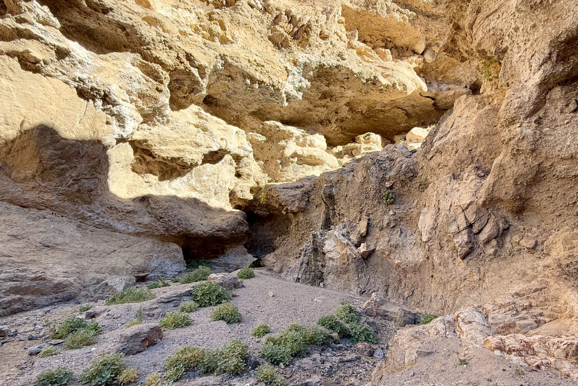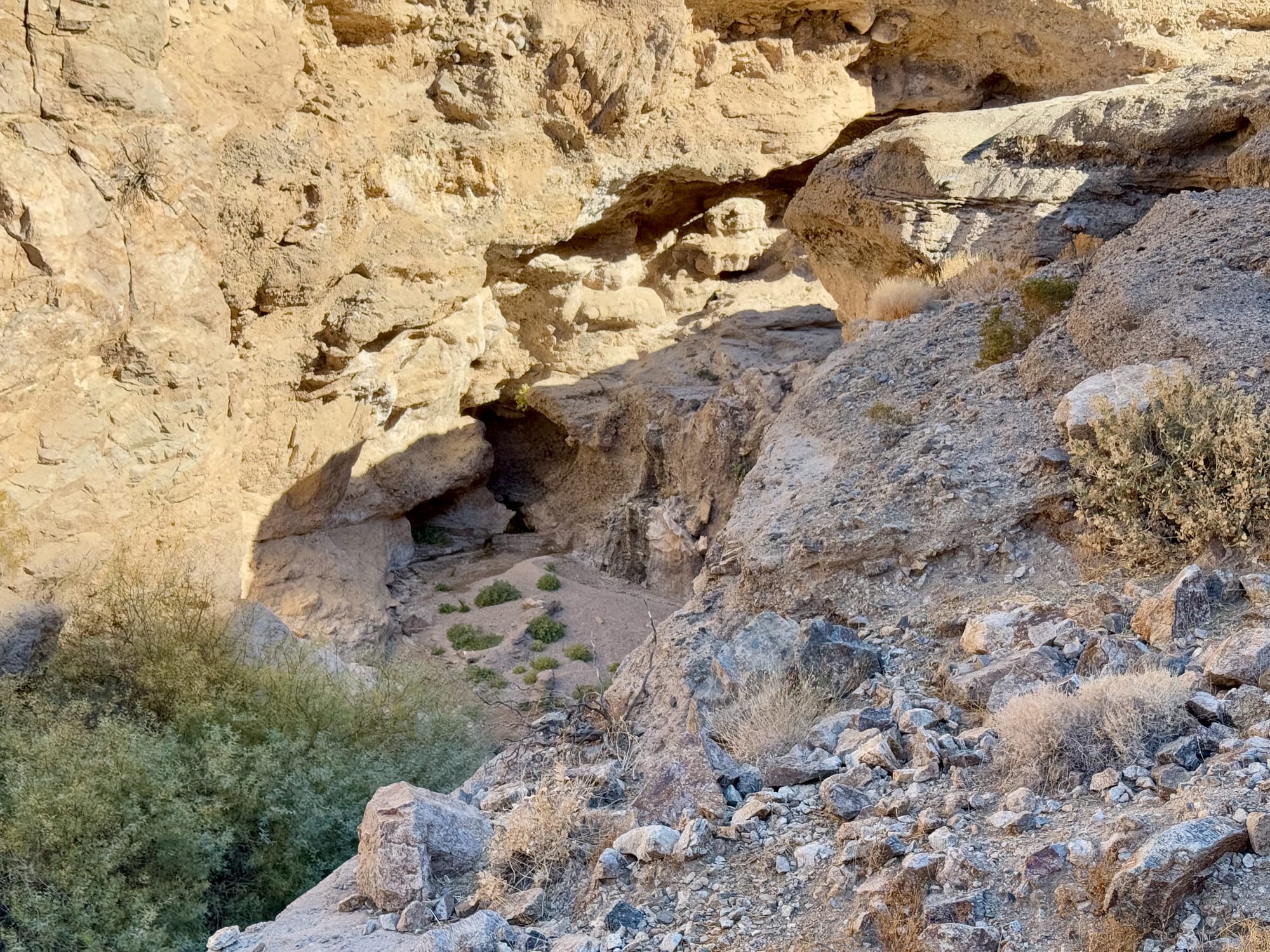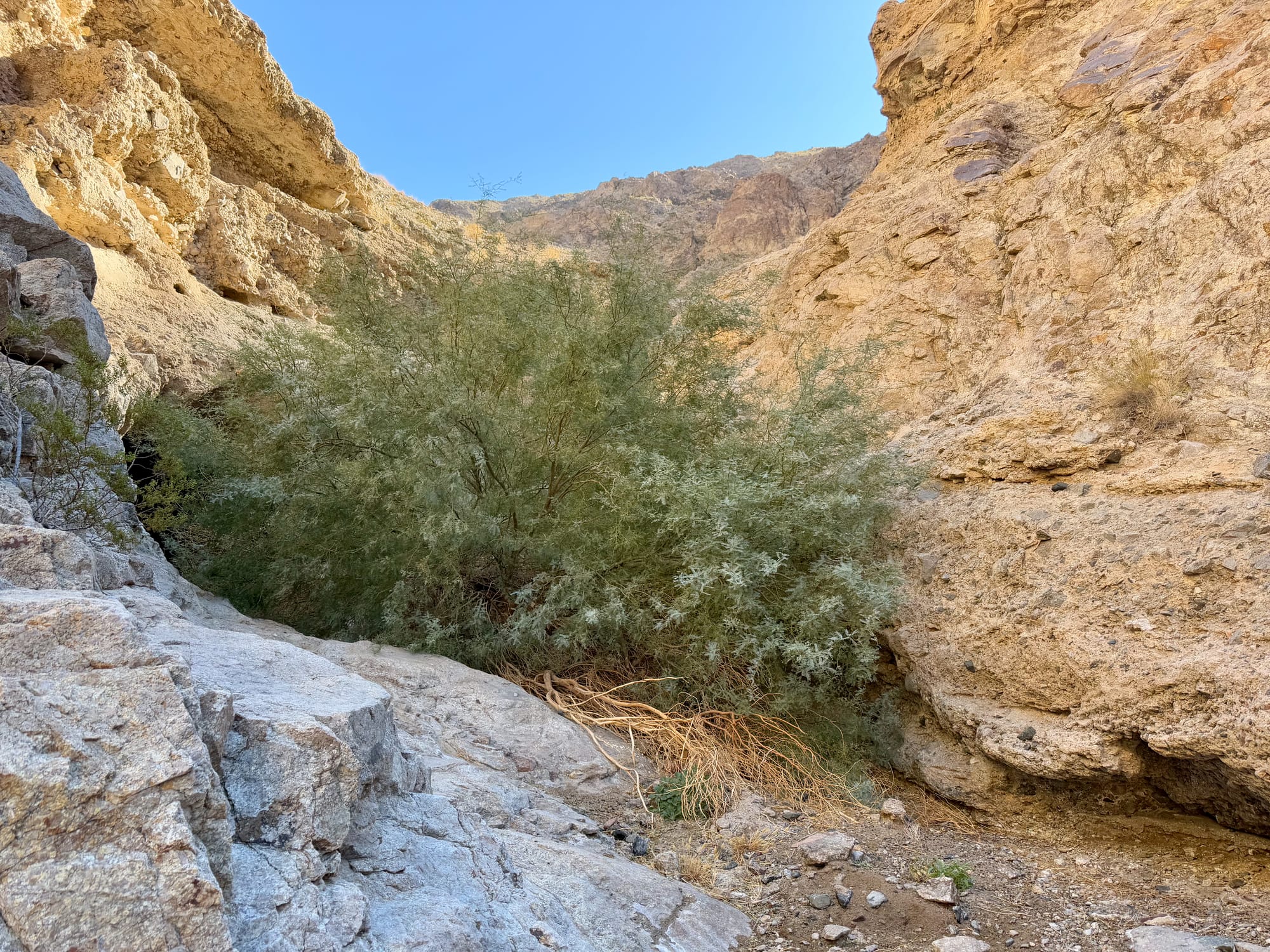 As you re-enter the canyon from the bypass your progress will be blocked by a large mesquite. There is a bouldery bypass (you'll get a few thorns) on the left side of the tree. The grotto behind it is worth getting pricked.