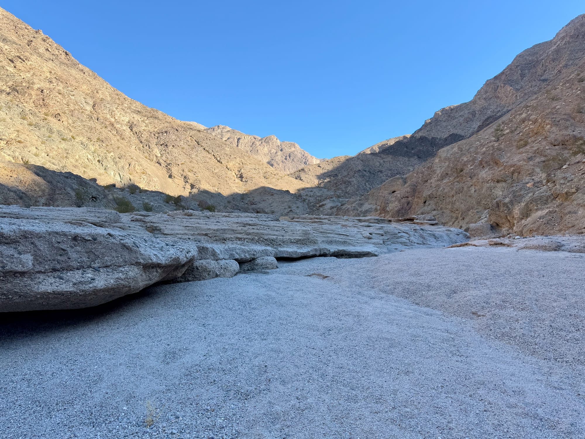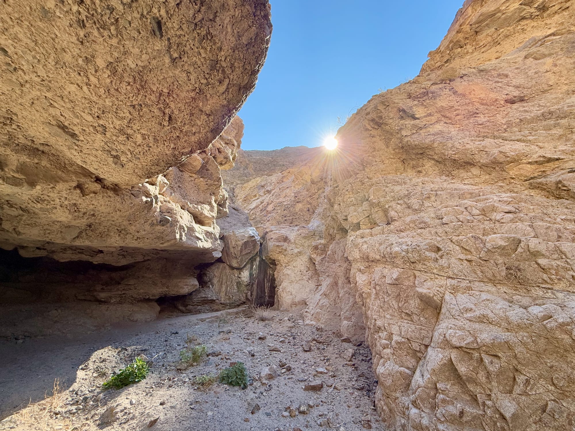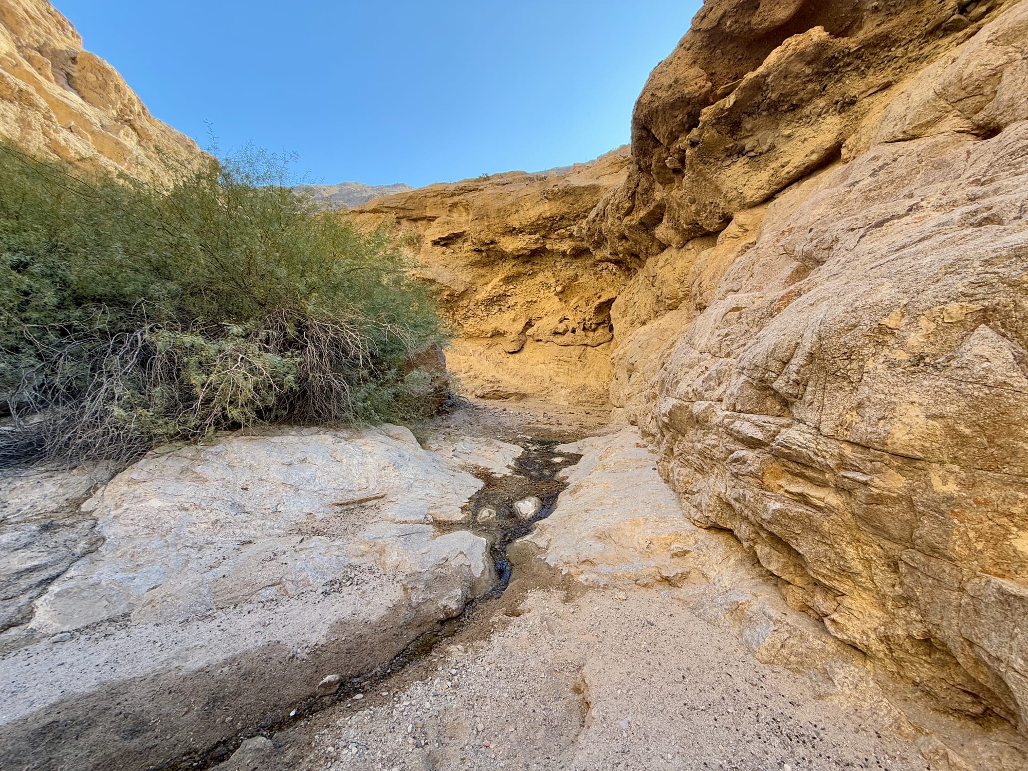 As you re-enter the canyon from the bypass your progress will be blocked by a large mesquite. There is a bouldery bypass (you'll get a few thorns) on the left side of the tree. The grotto behind it is worth getting pricked.