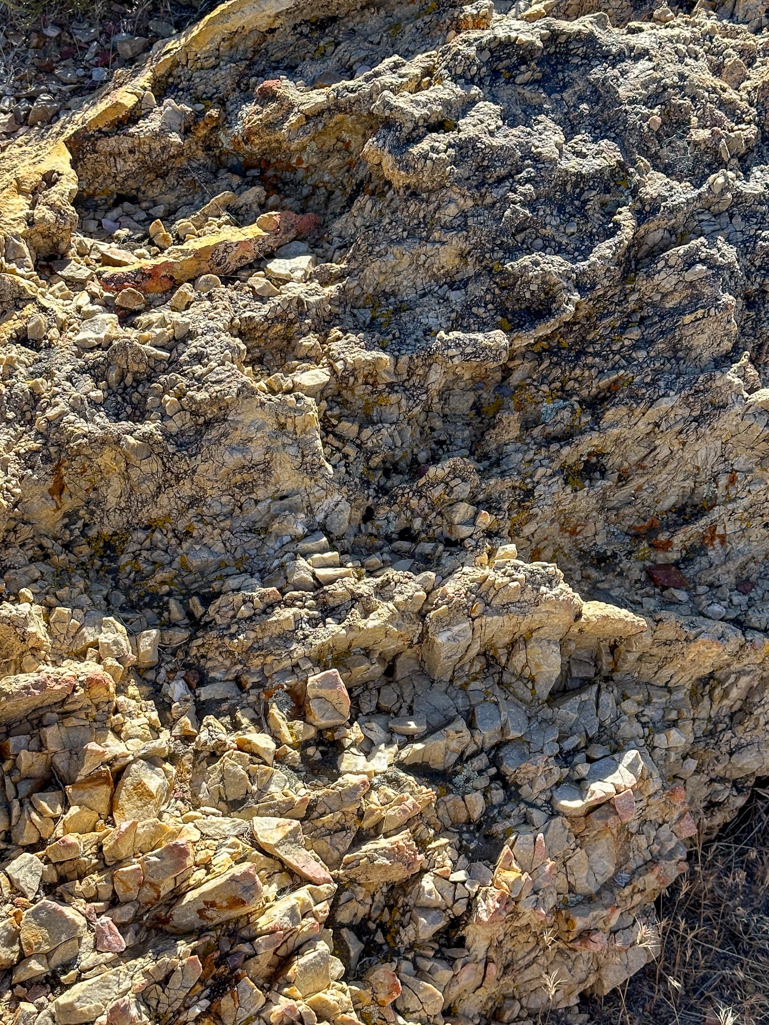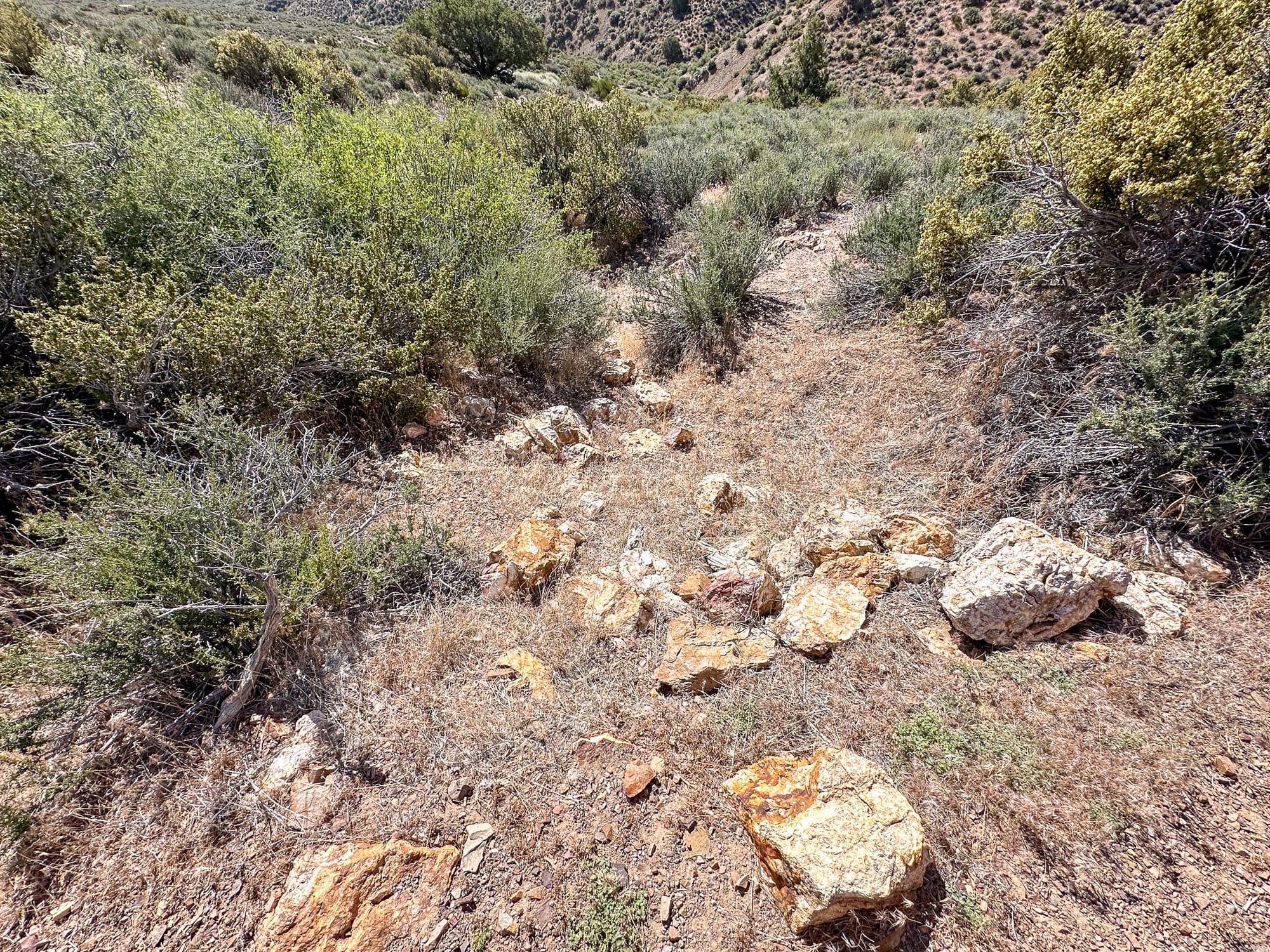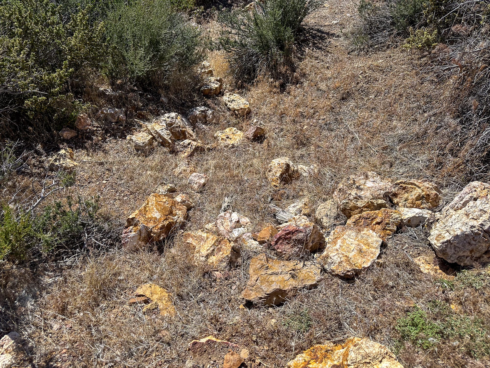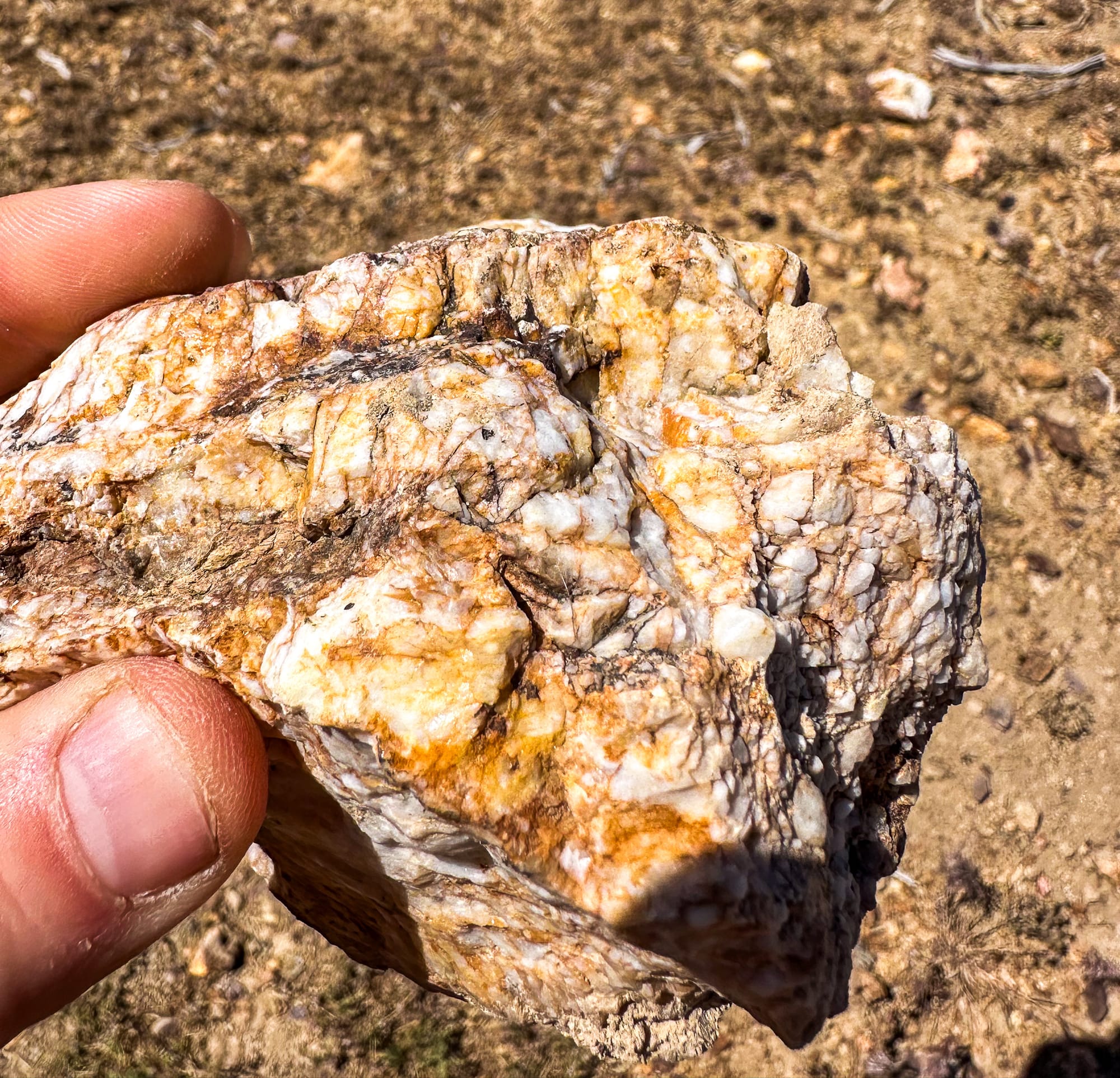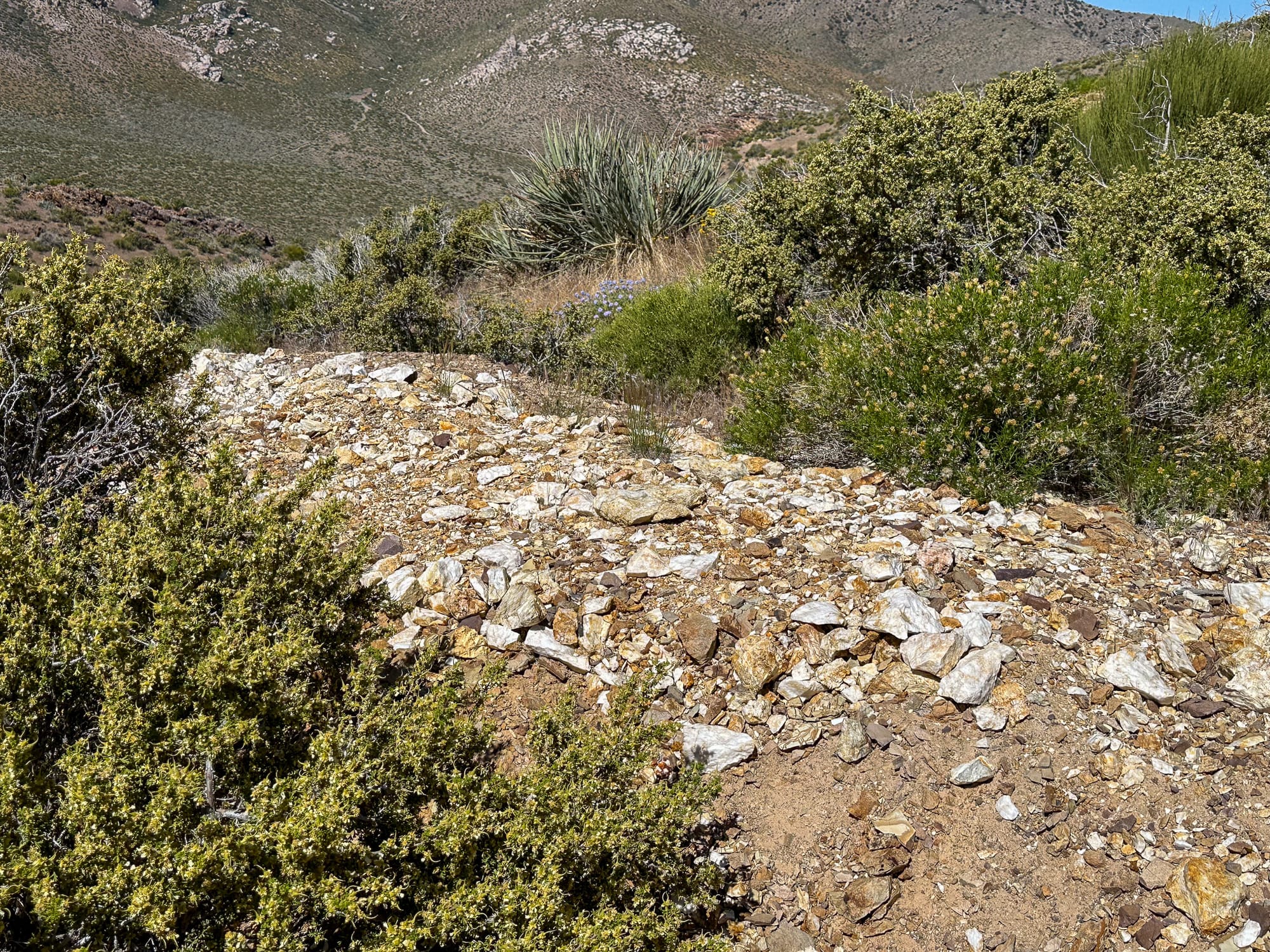 Broken pieces of the quartz vein that has been carried down into the wash beneath the hill.
