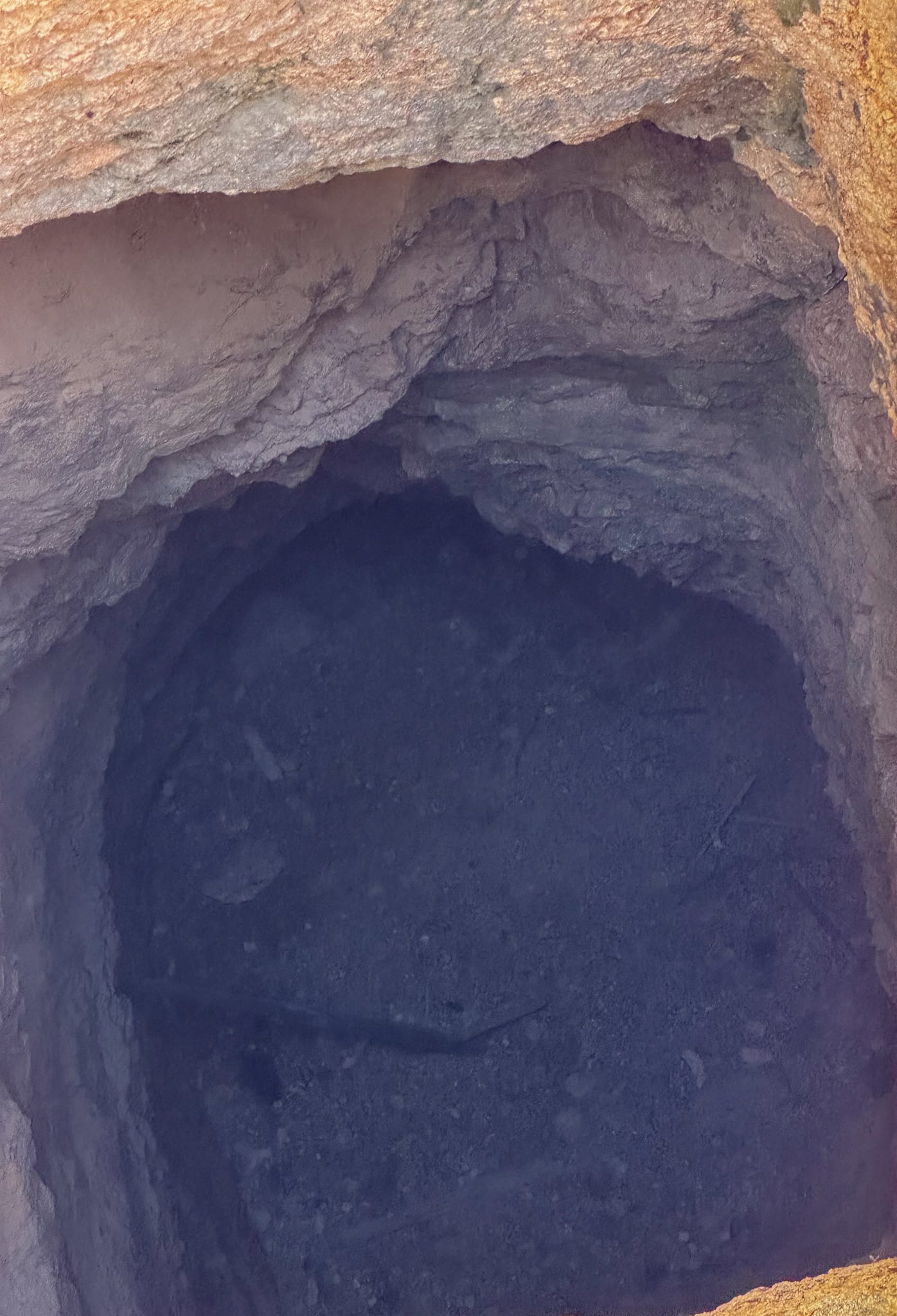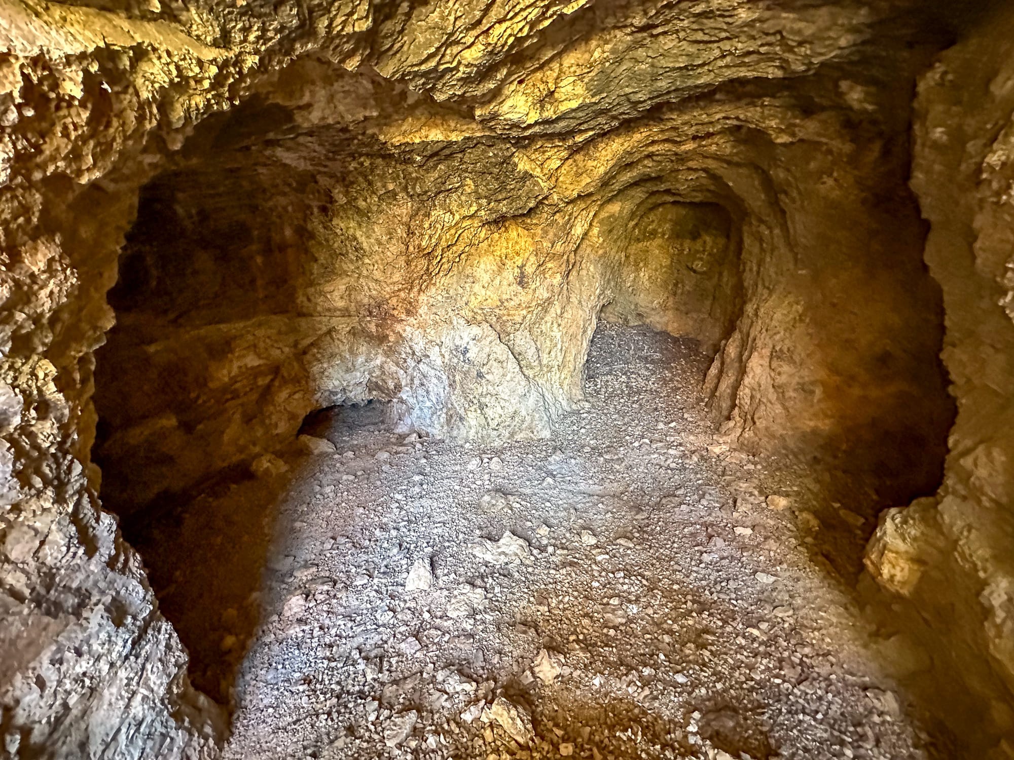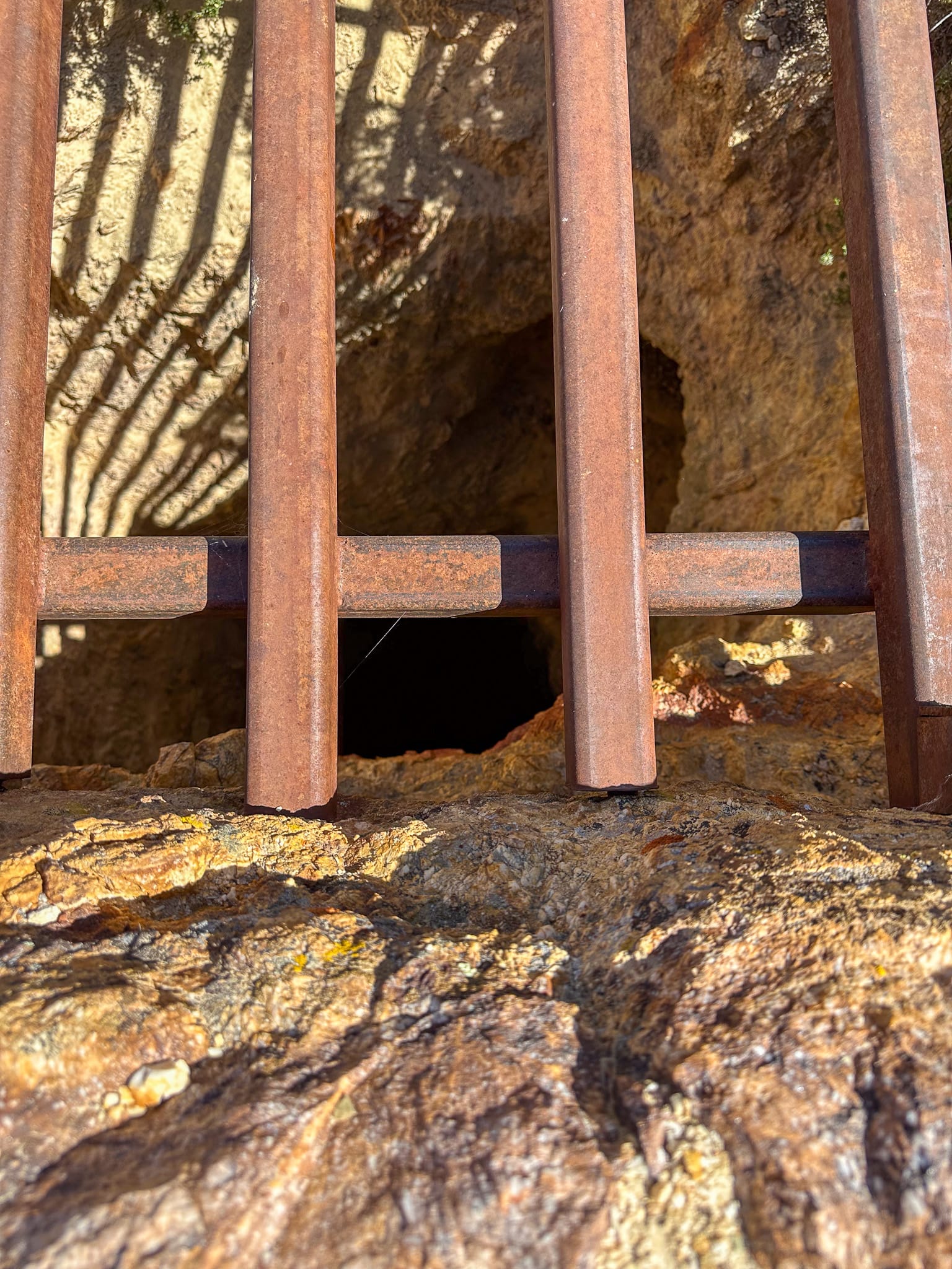 To the right of the shaft there is a short adit with some drifts off it. Looking down the shaft, which is supposed to be around 100' deep, didn't seem to be that deep. We did a rock drop test and the thud it made indicates there is a false floor around 50' down.