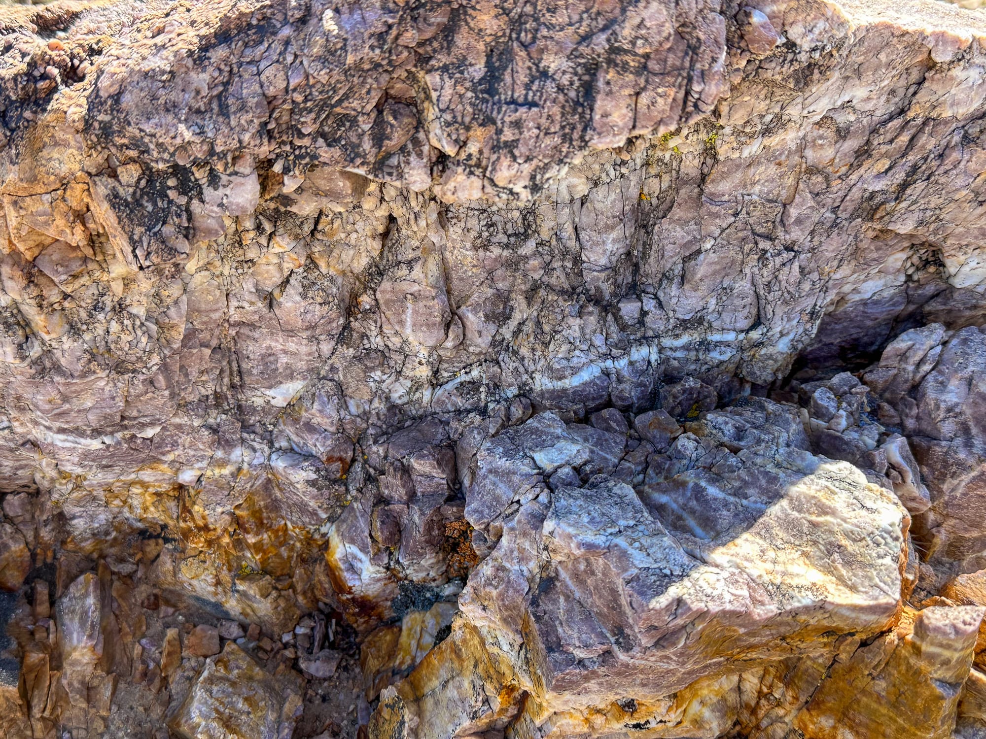 In addition to the jasperoid development, the area exhibits widespread silicification, particularly in the Johnnie Formation, Stirling Quartzite, and Wood Canyon Formation. This silicification is often cryptic but is expressed through fine, drusy quartz-lined fractures. Notably, at Rainbow Spring, the thick quartzites of the Johnnie Formation are partially to thoroughly silicified, brecciated, and re-silicified, with high concentrations of relict sulfide minerals undergoing intense leaching and goethitic alteration. The origin of these sulfide minerals—whether hydrothermal or preexisting metamorphic segregations—remains uncertain, although the hydrothermal hypothesis is favored.