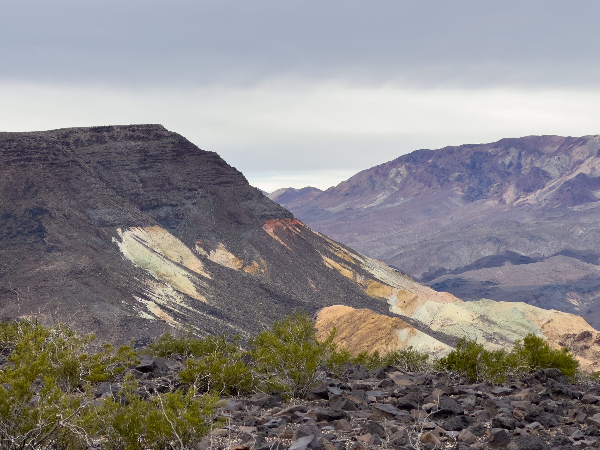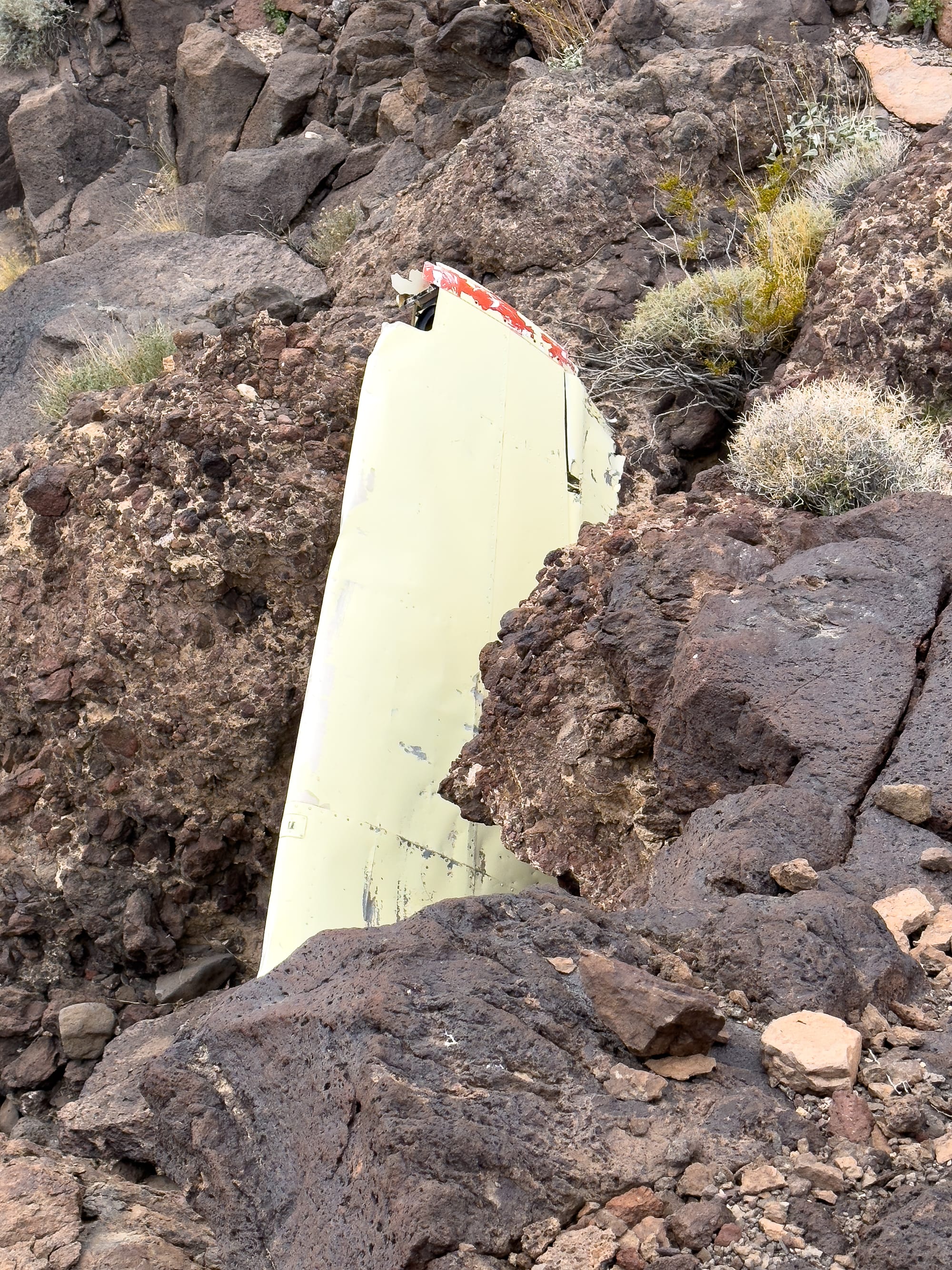 Even though we had the Jeep, we decided to park lower on the volcanic plateau and get some exercise. From this vantage point, we had a great view of Pyramid Peak and the rest of the Funeral Mountains across the valley.The wreck is atop that higher plateau west of the benchmark for Devair on the western flank of the Greenwater Range above the Widow Mine. In this shot, the Death Valley Railroad right-of-way is directly below us (see our trip The Death Valley Railroad (northern section for more on that).The northern Greenwater Range is geologically spectacular. It's old ocean bottom covered (and protected for millions of years) by a layer of lava. In this shot, Ryan Camp, California is just off the right hand side of the frame. You can clearly see the black layers of basalt lava from the Funeral Formation and then they suddenly stop at an orange-tan band which is the underlying oceanic sandstone from which the massive borax mines operated. In the distance is the Black Mountains where Dante's View is located and just beyond that is Badwater at 282 feet below sea level. As an unusual coincidence, I took the GPS coordinates for this photo and it was exactly 10 air miles to Badwater with a vertical relief of exactly 4,000 feet!As we climbed up the Devair plateau and turned west, the old Death Valley Railroad track bed became immediately obvious. Almost directly in the middle of the photo is the Played Out Mine waste rock and directly below us is the old miner's cemetery we found in our trip along the northern section of the DVRR.Turning west, we got our first look at what we suspected was the wreck. In this photo it's a small white spot on the left edge of the plateau slightly downslope. On the right side of the plateau is a small building which is the microwave facility referenced in the accident report. From here we had another 2 miles of walking to do - everything in the desert is further away than it looks.As we got closer, it became clear that we were looking at the wreck.We approached the wreck from below to be careful that we didn't accidentally knock any rocks down onto it or disturb the wreck itself. What you see in this photo is mostly the right wing and remnants of the fuselage. None of the wreck was removed, but there isn't much of the main cabin left as it was consumed in the post-crash fire.As we got closer, we began seeing more small parts of the wreck that were thrown forward (towards the east) during the impact.Electronics thrown clear of the main point of impact.Some sort of gauge or sensor thrown clear of the main point of impact.The main wreck, at the point of impact, is comprised mostly of the right wing and burned out remnants of the fuselage. You can see the flap was thrown clear of the wing at impact and the landing gear is intact.Gauge housing.Control box, possibly radio or PA.Close-up of the right wing and landing gear. The Lycoming power plant.The overall wreck site with the wing, horizontal stabilizer, power plant, and some structural framing. Lower in the near distance is the borax deposits of the Widow Mine. Further out is Greenwater Valley and the Black Mountains. A radio.Nose landing gear.Seatbelts.A cross for LaVern DeBerg, the pilot and sole fatality, in this crash. A memorial for LaVern DeBerg, the pilot and sole fatality, in this crash. October 10, 1938 December 23, 1995The other wing is about 60 feet down from the main wreck in a gully. Rocks at the initial point of impact still showing scrapes 29 years later.As we walked backed the overcast skies that had been with us most of the day began to clear revealing a spectacular view of Pyramid Peak. I can't speak for LaVern, but I think this isn't the worst resting place a man could have. "If mortals could choose, and if heaven should ask us Here's where I'd want to spend all of my days"- Marty Robbins